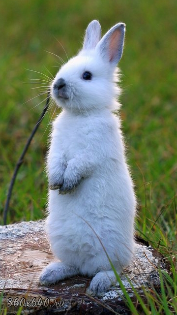 Белый пушистый крольченок в своей естественной среде обитания — сидит на пне и позирует, как и положено всем белым пушистым крольчатам.